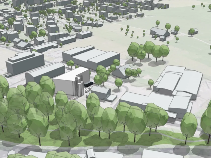 Die Basis des Wärmeverbunds bildet eine neue Holzheizzentrale im Rainacher, direkt neben der Holzhandelsfirma Herzog-Elmiger AG. Der Standort ist ideal erschlossen, ohne Durchfahrt durch Wohnquartiere. Die folgende Visualisierung bildet den Planungsstand vom November 2025 ab.