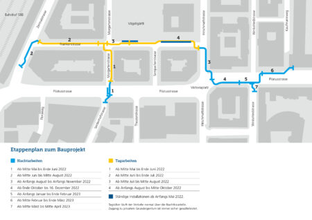 Der Leitungsbau mitten in Luzern wird in Tag- und Nachtarbeit erstellt. Damit der Verkehrsbetrieb auf den Hauptverkehrsachsen auch während der Bauzeit sichergestellt ist, erfolgen die Arbeiten dort jeweils bei Nacht. In den Quartierstrassen finden die Arbeiten mehrheitlich bei Tag statt (siehe Plan). Bewusst realisiert ewl den Leitungsbau in Kleinstetappen, um längere Baustellen an einem Ort zu verhindern und mit den Grabarbeiten gezielt fortzuschreiten. Die Beeinträchtigungen werden möglichst geringgehalten. Der Zugang und die Zufahrt zu privatem Grundeigentum sowie zu Geschäften, Restaurants und Hotels sind immer möglich.