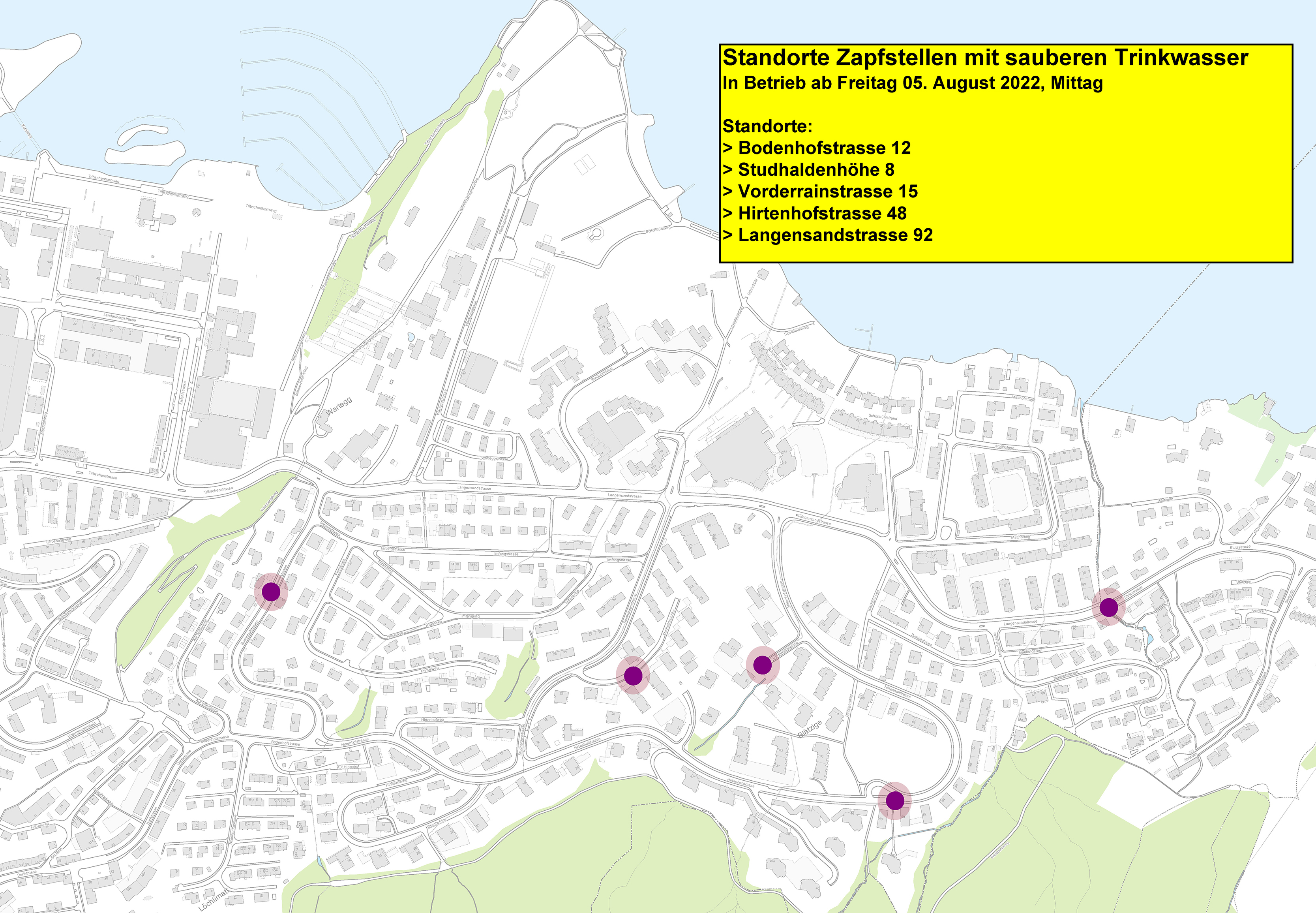 Für die betroffenen Anwohnerinnen und Anwohner hat ewl ab heute Mittag, 5. August 2022, Zapfstellen mit sauberem Trinkwasser an fünf Standorten installiert. Die genauen Standorte finden Sie in der Beilage.