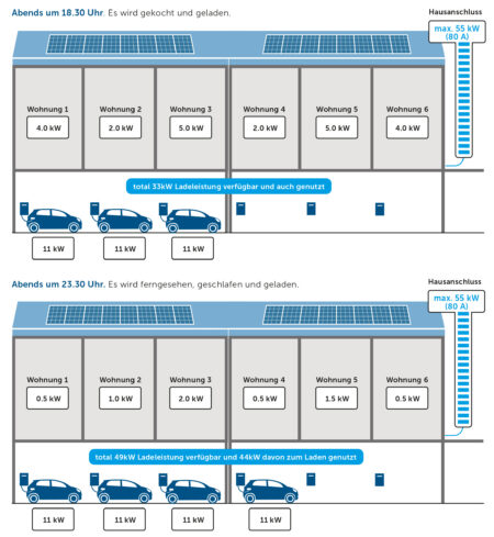Das intelligente Lademanagement begrenzt die maximale Leistung der Ladeinfrastruktur und verteilt sie auf die genutzten Ladestationen. Dadurch wird eine Entlastung des Hausanschlusses gewährleistet – und dies ohne merkliche Komforteinbussen für jene, die ihr Fahrzeug laden. Ist einmal zu wenig Leistung vorhanden, zum Beispiel wenn alle Ladestationen voll belegt sind, dann verteilt das Lademanagement die Ladeleistung sinnvoll und gleichmässig, damit trotz dem temporären Ansturm, dennoch alle Elektrofahrzeuge geladen werden können.