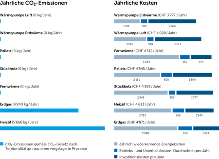Öl- und Gasheizungen sind beim Kauf und bei der Installation günstiger als andere Heizsysteme wie Pelletsheizungen, Wärmepumpen oder Fernwärme. Wenn man hingegen die Betriebskosten hinzurechnet, so sind über die ganze Lebensdauer von durchschnittlich 20 Jahren gerechnet die Kosten für eine alternative Heizung nicht höher, im Gegenteil. Bei den jährlichen CO2-Emissionen schlagen alternative Heizsysteme die alten Öl- und Gasheizungen um Längen (vgl. Grafik). Alternative Heizsysteme haben zudem den Vorteil, dass sie von den Kantonen gefördert werden, was die Installationskosten senkt.