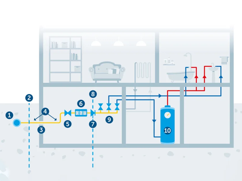 Die Grafik zeigt den typischen Wasseranschluss von heute: Vom Hauptanschluss in der Strasse gelangt das Wasser in den Keller. Dort übernehmen Ventile, Filter und Zähler die Kontrolle, bevor es über die Hausinstallation in Küche, Bad und Boiler für Warmwasser verteilt wird.